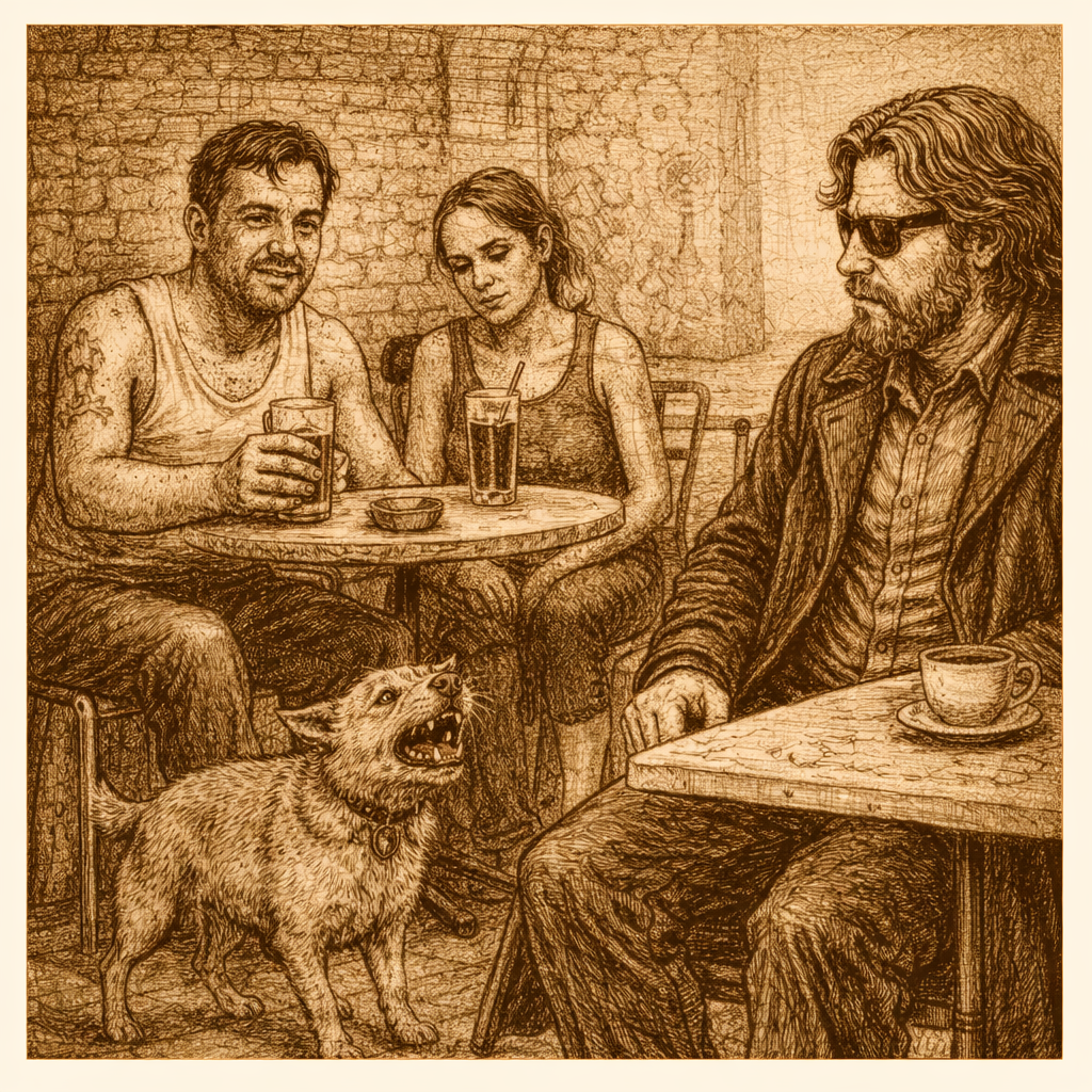 Hij schenkt zijn bier zijn glas in terwijl de hond de leiband rond zijn benen wikkelt. En blijft grommen naar me. “Rocky, kom op, nu is het genoeg,” zegt de man. Hij duwt de hond naar mij toe, waarop die nog harder schrikt, begint te kefgrommen en onmiddellijk weer achter zijn benen vlucht. “Je mag dat niet forceren he, dat weet ik eigenlijk ook wel.”