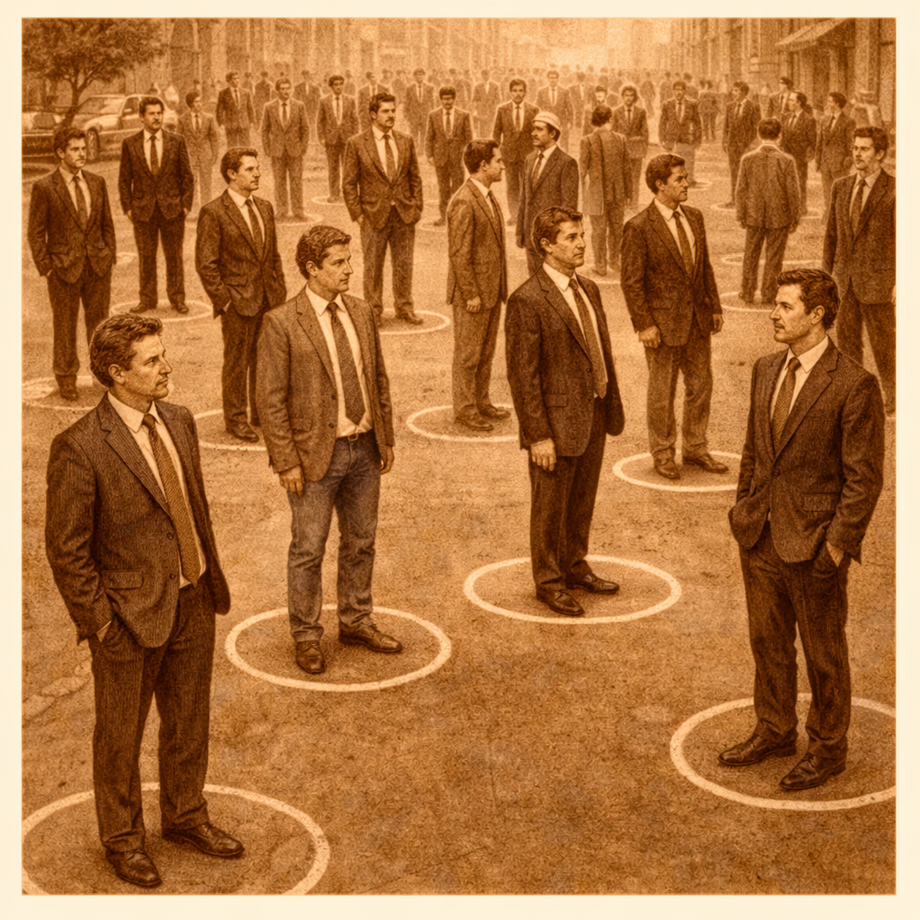 Bij nadere inspectie staan ze allemaal op speciaal aangegeven cirkels. De cirkels zijn op de grond getrokken. Ze zijn over de hele straat verspreid. Nogal willekeurig. Dan valt het kwartje. Ach, natuurlijk, denk ik. Het zijn standpunten. Hier een standpunt, daar een standpunt. Toe maar. Het wemelt ervan, zo op één oogopslag. Even bewonder ik het uitzicht. Het gebeurt niet elke dag, dat je zoveel standpunten ziet. Het merendeel van de tijd is het behoorlijk standpuntloos in ons landje. Maar vandaag zijn ze er, en ik kan dat niet ontkennen. Ik vraag wat de mannen hier zoal komen zoeken. We zoeken niet, zegt er eentje. We vínden. De rest knikt instemmend.
