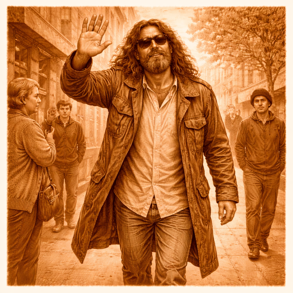 Daarna trek ik schoenen en een jas aan. Deur uit. Even uitwaaien. Naar de mensen. Lopend door de wijken roep ik: “Joehoe !” Ik zwaai. “Joehoe ! Joehoe ! Joehoe !” Enzovoorts. De mensen kijken op. Kijken aan. Kijken na. Kijken om. Ze kijken. Yes ! Ik kan het wel, denk ik bij mezelf. Dus zo doe je dat, die zelfpromotie. Maar dit is wel tijdrovend. Er zijn heel veel wijken in dit land. De hoek omdraaiend, besluit ik te testen of het in iets grotere aantallen kan. Ik ga breed en opvallend in beeld staan en zwaai. Joehoe ! En jawel: de volle bus toetert terug. Indringend.