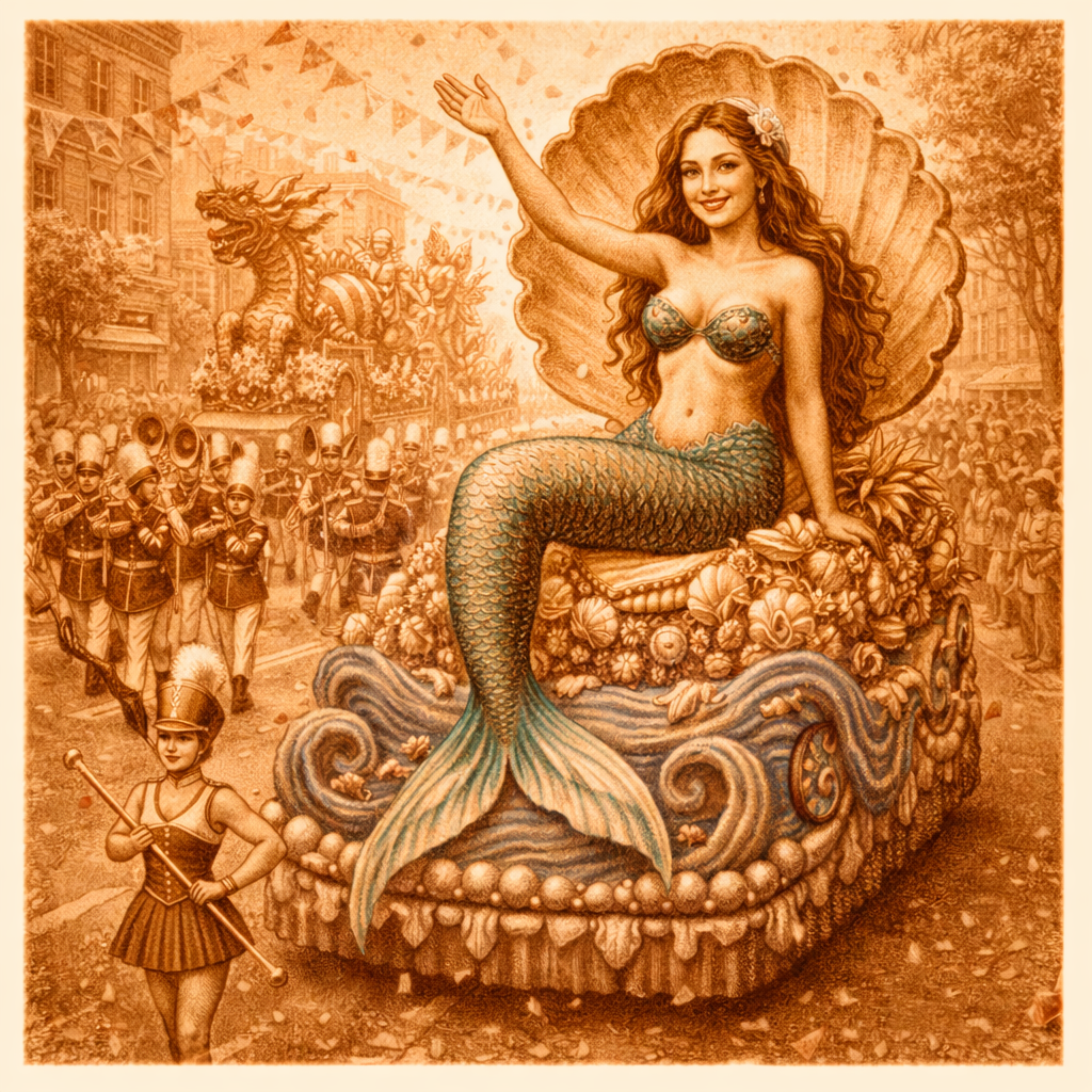 We drinken wat koffie en meteen erna bier. Het is weekend en zonnig. Het leven is mooi. Ik kijk met slaperige ogen om me heen. De striptekenaar geeft me mijn boek over burnout terug. Het boek heeft me door mijn zwarte jaar heen gesleept en hij had recent hetzelfde euvel. We kijken een serie die de striptekenaar nog niet kende. Dan plots breekt er een zwik lawaai door de stilte. Een drumgroep loopt langs mijn huis. Er dartelen danseresjes over de straten en op een grote houten praalwagen zit een zeemeermin. Ze zwaait sierlijk. Ze is mooi. Iedereen is mooi.