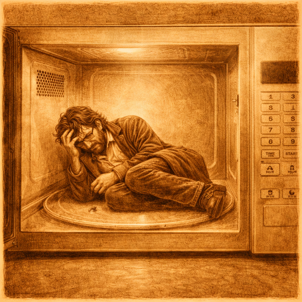 En daar lig je nu. Je ontbijt piept in de magnetron. Het piept nog eens, even later. “Heb je me gehoord ? Het eten is klaar en zo. Ik zeg het maar.” En nog eens. “Hee, voor mij is het niet relevant he, maar dat eten van je is warm. Het wordt steeds minder warm.” En nog eens. “joehoe, kom je het nog halen ? Je mag het evenzogoed laten liggen hoor, kan mij echt niet schelen. Maar eh, waarom heb je me dan überhaupt dit laten opwarmen ?” En nog eens. “Pieperdepiep. Is daar iemand ? Is er nog iemand thuis ? Ben ik helemaal alleen ? Ik vind dit maar eng. HELP !” En nog eens.