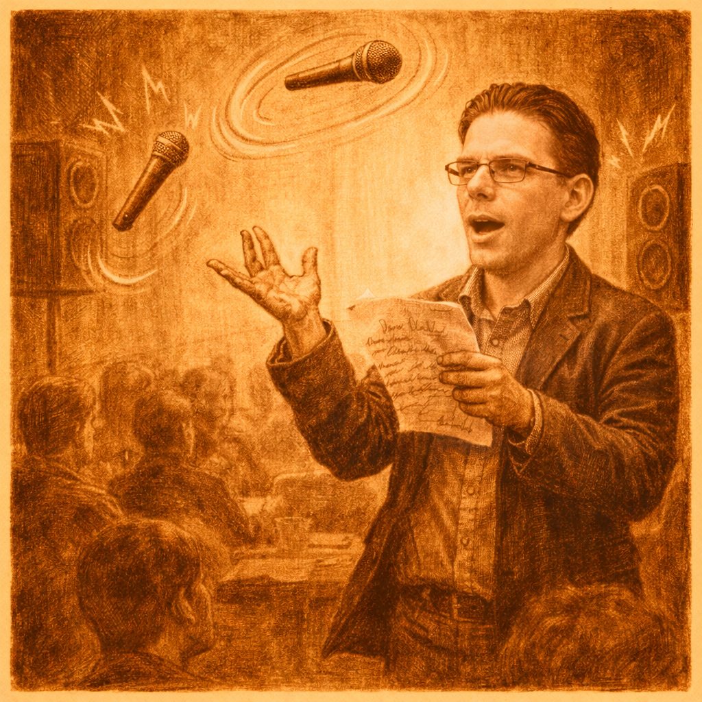 Ik ben bij een dichtpresentatie. De bundel die gepresenteerd is, kost meer tijd om te lezen dan de presentatie zelf. De reistijd in de trein was langer dan de presentatie zelf. Dat verzucht zéker ook een dichteres naast me, die een nog drie keer langere reistijd had. Uiteindelijk dus zes keer. Nee wacht, drie. Ook ik ging uiteindelijk, naar het schijnt, weer terug. Enfin. De presentatie is snel voorbij. De dichter die een bundel presenteert, leest wat voor. Nee, ik vergat het bijna: eerst leest iemand anders een gedicht van hem voor. Iemand die enorm vereerd is met het eerste, uitgereikte exemplaar. En dan de dichter. Hij leest gek voor: de microfoon houdt hij vast zoals niemand een microfoon vasthoudt. Als een wijnglas. Alsof hij zijn gedichten debiteert aan een bodem wijn. Hij klotst de microfoon in zijn vingers. Dan weer links, dan weer rechts. Cirkeltjes draaien. Naar de mond, van de mond af. Het geluid is verschrikkelijk, maar wat een spektakel om aan te zien.