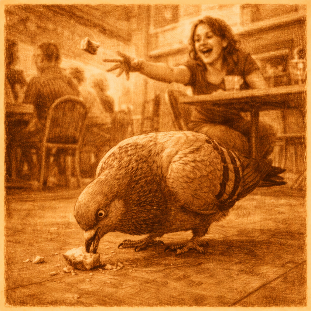 Vrolijk lachend werpt ze. Telkens weer een stukje. Ze pulkt het af van haar broodje en gooit het. Naar de gulzig schrokkende duif naast hun tafeltje. De vrouw wordt blij van de schranzende vogel. Ze pulkt nog wat. De duif gooit met zijn snavel het brood in de lucht, in een poging het te scheuren. Het stuitert naast zijn voeten en onmiddellijk slaat de snavel weer toe. Het is een geoefende stadsduif. De vrouw kan nog net het kirren laten, maar ze oogt alsof ze zou willen kirren. Er komt nog een duif toegelopen op het voedselstrooien. Dat spoort de vrouw alleen maar aan tot nog meer broodgooien.