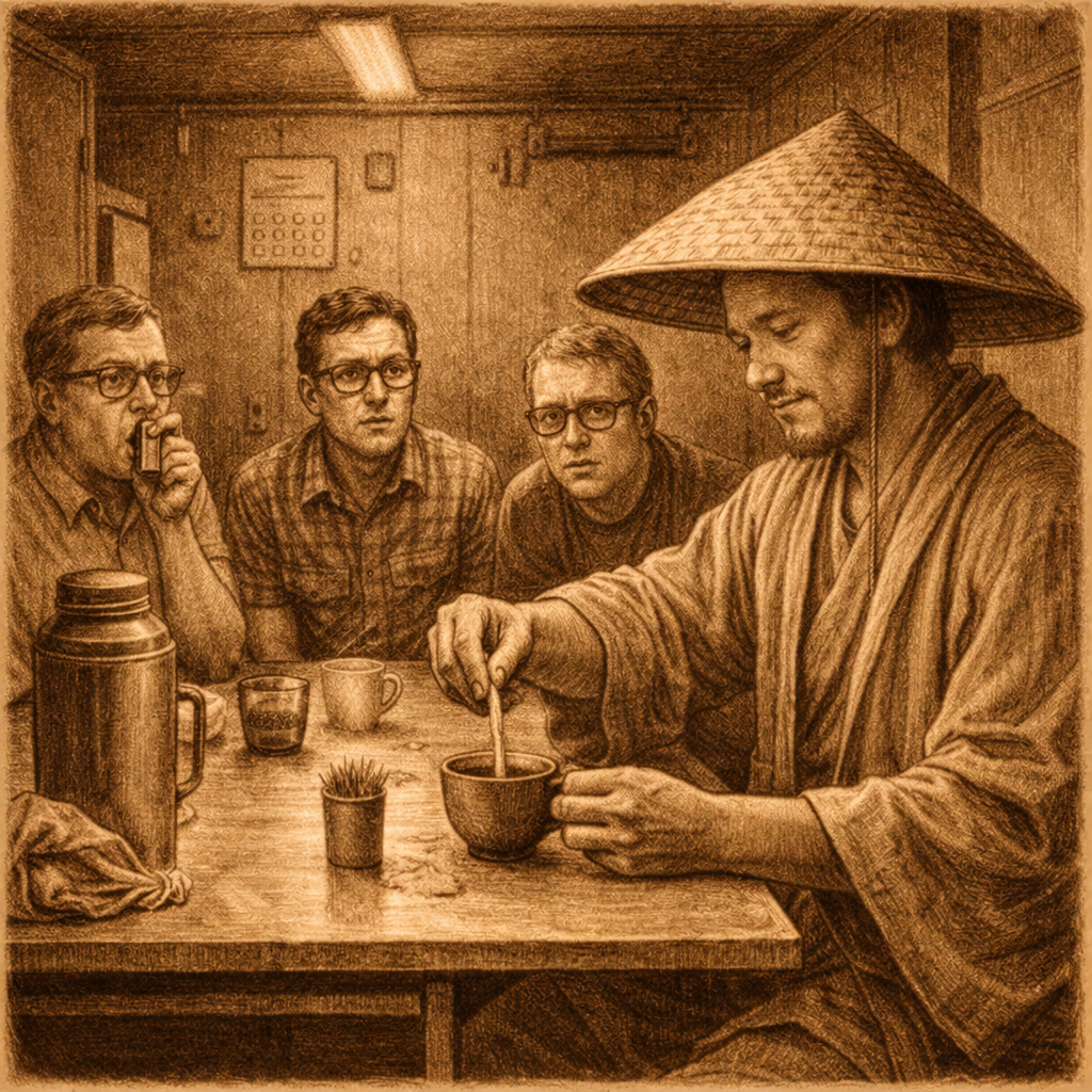 Binnen zitten drie zenuwachtige mannen met brillen. Één trekt nerveus van een astma-inhaler. Lee gaat zitten en schenkt een kop groene thee voor zichzelf in. Dan pakt hij wat suikerriet om erin te roeren. Voor de smaak voegt hij wat tarwegraspoeder toe. Hij legt uit dat het soms in je voordeel werkt om niet de allerbeste ergens in te zijn. “Iedereen streeft er altijd maar naar om de beste te zijn, de top te bereiken,” en hij sipt voorzichtig van zijn kopje om te zien of het te warm is of niet, “maar wij zijn de beste geworden in niét het beste zijn.”
