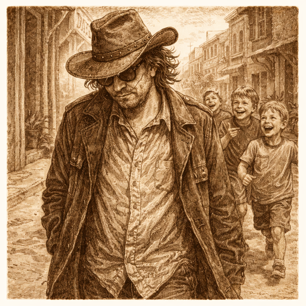 Ik loop over straat met mijn hoed op tegen de regen en de zon. De deur zwaait open en de Abraham neemt gretig mijn felicitatie aan. Kinderen gillen me na: “Kijk, daar, daar loopt een kooijbooij ! Een kooijbooij !!” De Abraham wijst me waar de drank is. Ik slenter in feite maar wat – ik weet waarom ik mijn huis heb verlaten, maar het is niet om de kooijbooij uit te hangen. De gastheer kijkt rond en bedenkt zich dat ik, inderdaad, waarschijnlijk niemand hier zal kennen. De kindjes rennen achter me aan: Meneer kooijbooij, meneer kooijbooij, ga je boeven of indianen schieten ? Hij schrikt lichtjes: nee, je kent inderdaad niemand hier.