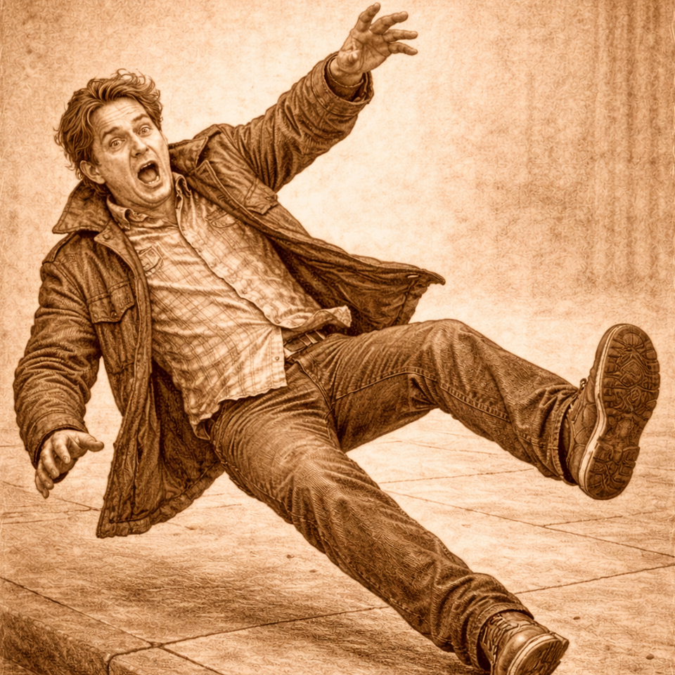 Op straat krabbelt een man overeind. Hij klopt zijn jas en broek af. Even kijkt hij om zich heen. Hij is de enige op straat. Als hij verderloopt, heeft hij zichtbaar last van zijn enkel. Glad weertje vandaag, constateert hij.