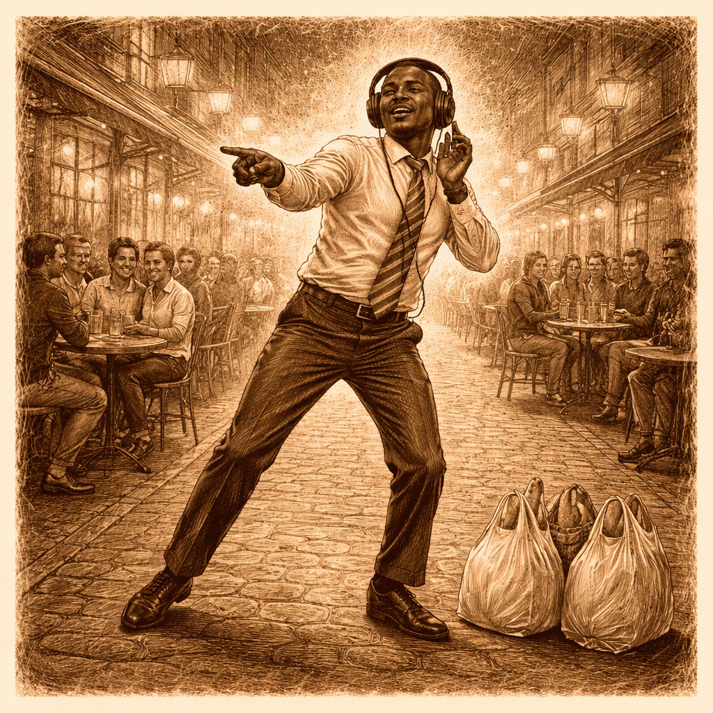 Hij stond er. Ineens. Een man met een sprekend, doch onopvallend gelaat. Donkere huidskleur. Blauwwit overhemd. Gestreken broek. Gepoetste schoenen. Stropdas in een Windsor. Drie plastic tassen. Hij zette ze op de grond. Viste er een tijd in. Haalde er een muziekding met reusachtige koptelefoon uit. Zette de koptelefoon op en begon te swingen. Middenop de caféstraat.