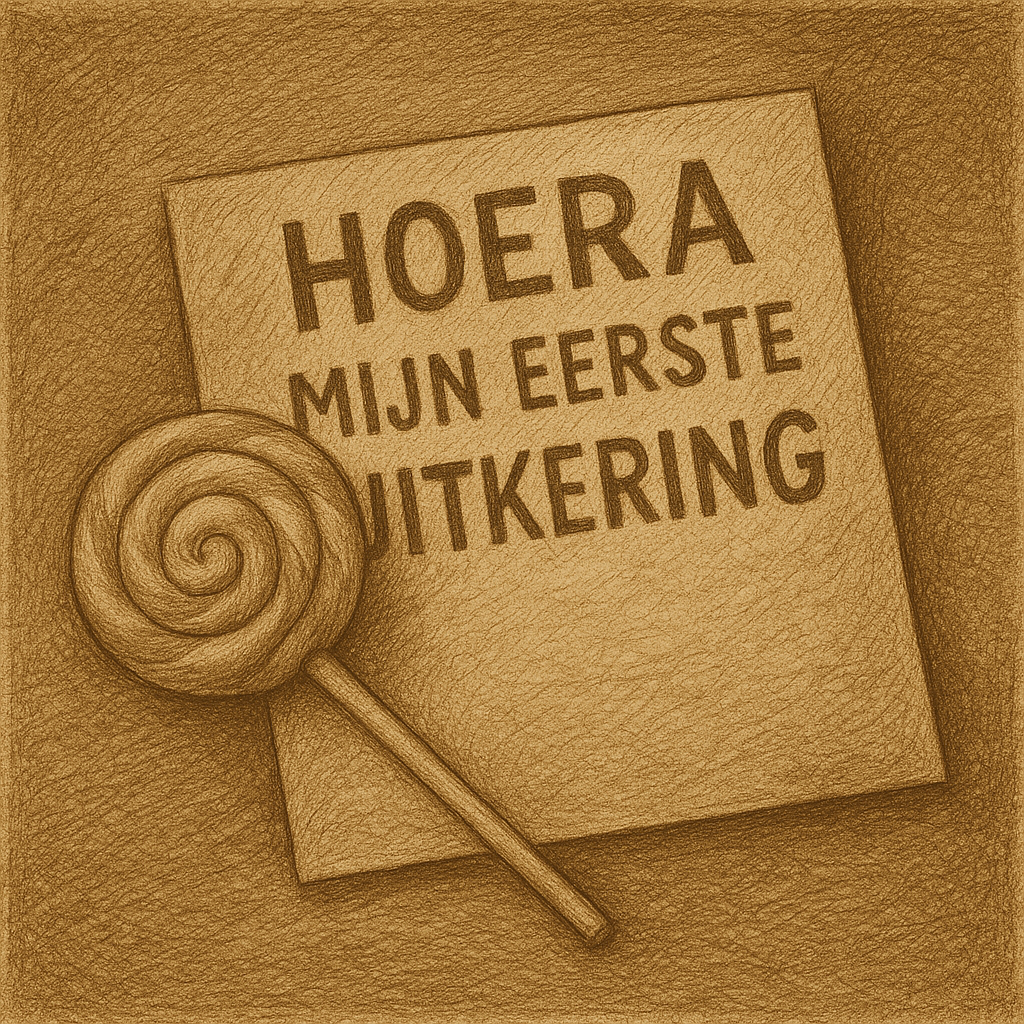 Als hij zich omdraait, blijkt hij echter een lolly te hebben gepakt. De letters van de uitkeringsinstantie staan er in vrolijke kleuren op. Ook een kleurige kaart, “HOERA MIJN EERSTE UIT-