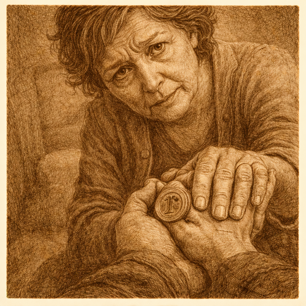 Als ik op wil staan, pakt ze mijn arm vast. Half staand stop ik. Met haar andere hand geeft ze me een euro. Ze vouwt hem in mijn handen en duwt die zacht maar ferm dicht. Dan geeft ze er een bemoedigend klopje op met haar vlakke hand. Tevreden lacht mijn moeke. Met die hartverscheurende blik van iemand die tegen beter weten in ergens in blijft geloven.