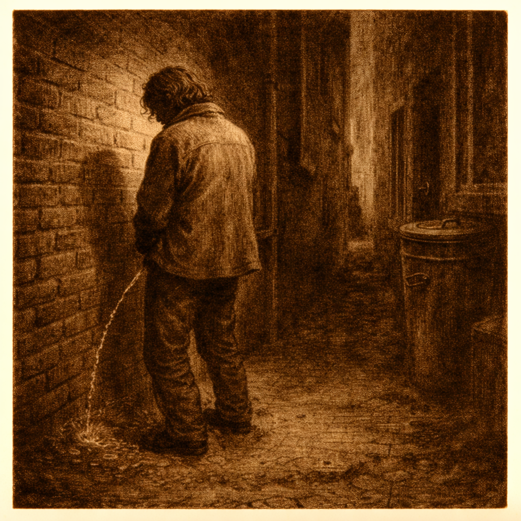 Toevallig moet ik ook echt plassen, dus ik zoek een schaduwrijk plekje op. Maar ik overweeg serieus om te vluchten. Mijn set is niet goed genoeg. En bij mijn openingsgedicht zal ik keihard op mijn bek gaan. Fuk dit. Ik treed verdomme nooit meer op. Ik druppelschud en rits daarna mijn broek dicht. Ja hoor. Nadruppels. Ook dat nog.