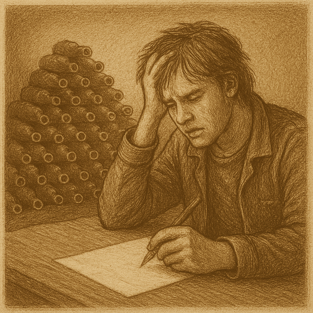 Gefrustreerd boog hij zichzelf achterover en klauwde aan zijn haar. En zelfs dat was verdomme een cliché.