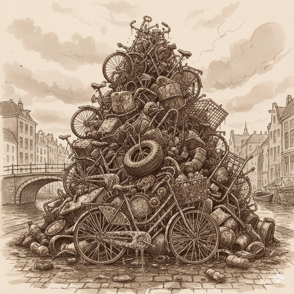 Inhoudelijk is de dregberg weinig verrassend. De inwoners van Prozacstad gooien volslagen fantasieloos afval in hun kanaal. Een aantal verroeste fietsen. Autobanden. Bouwafval. Huishoudelijke apparaten. Nooit eens een dildo. Of een schatkist met goud. Of liefde. De berg is grauw en zwart, en stinkt naar rot. Dat de rot er nog zin in had, verbaast eigenlijk wel. Maar de rot is niet kieskeurig. De rot hapt overal graag in.
