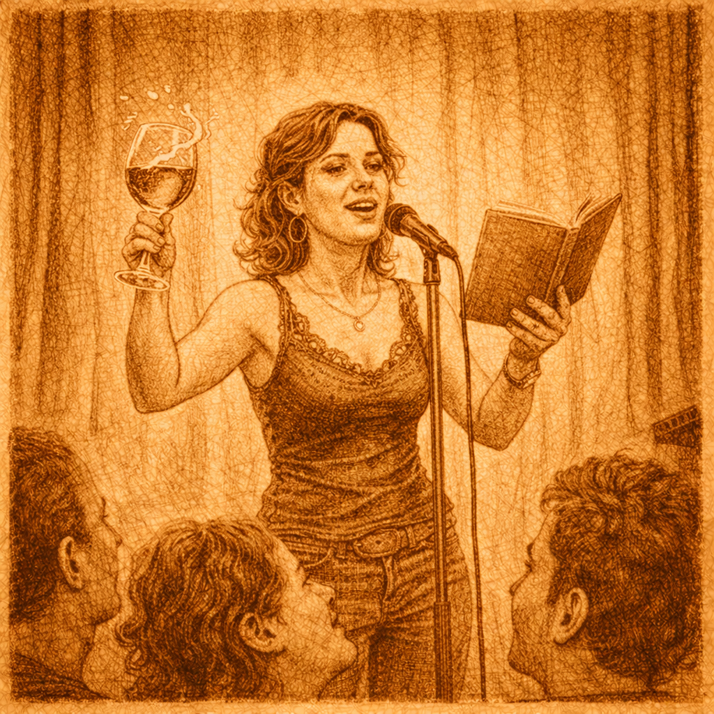 Ik buig me, toegegeven, ietwat oncharmant naar voren om mijn volle glas aan te pakken, waarbij mijn tieten net niet uit mijn hempie glippen. Ach, je wordt maar vijftien keer achtentwintig. Ik neem een diepe slok, hoest, veeg lachend mijn mondhoeken schoon en vervolg uit mijn recentere bundel, De biologische klok is getikt. Bewonderend luistert iedereen naar mijn thematisch brede oeuvre. Tussen de gedichten door drink ik mijn glas leeg, want de woorden moeten wel zwemmen in mijn mond.