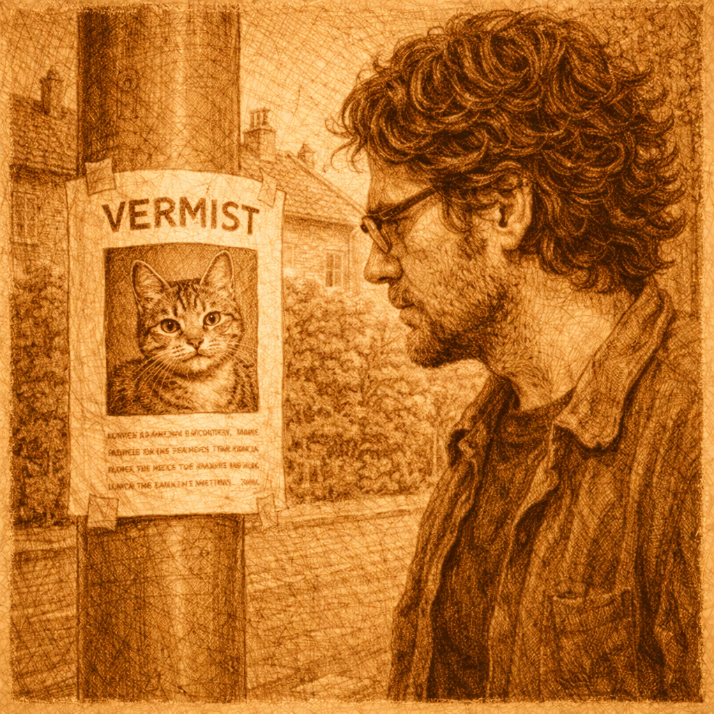 In deze straat worden alle katten vermist. De bomen en lantaarns hangen vol met poezensnoeten. Geen enkele kat wil hier blijkbaar blijven. Zwetend strompel ik langs de telefoonnummers en grote hoofdletters. De baasjes zijn ten einde raad.