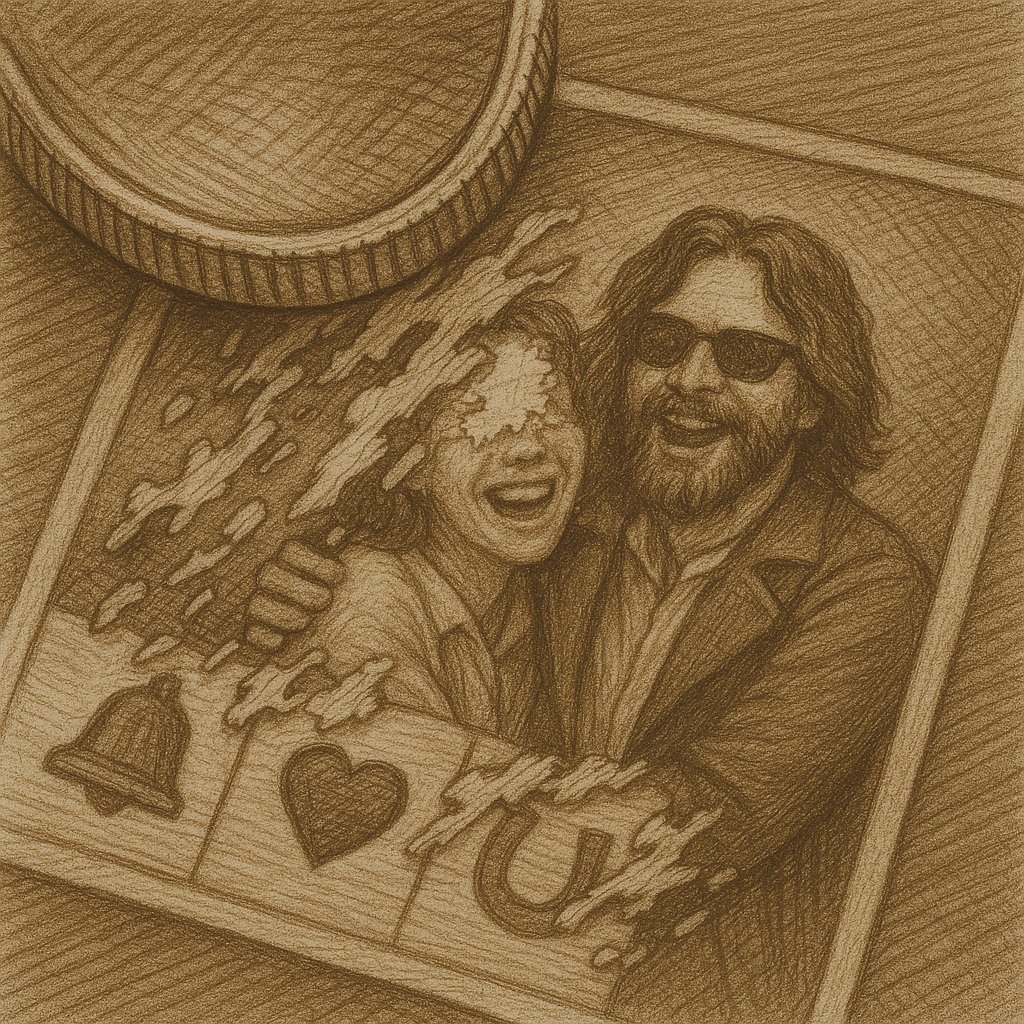 Het zijn zonnige plaatjes die mensen vrolijk maken. Andere mensen. Niet mij. Zeker niet nu. Daar staan we, buiten de winkel, allebei te krassen. Zoals verwacht is mijn lot prijsloos. Het hare ook. Ik haal mijn schouders op en grap dat we tenminste geluk hebben in de liefde.