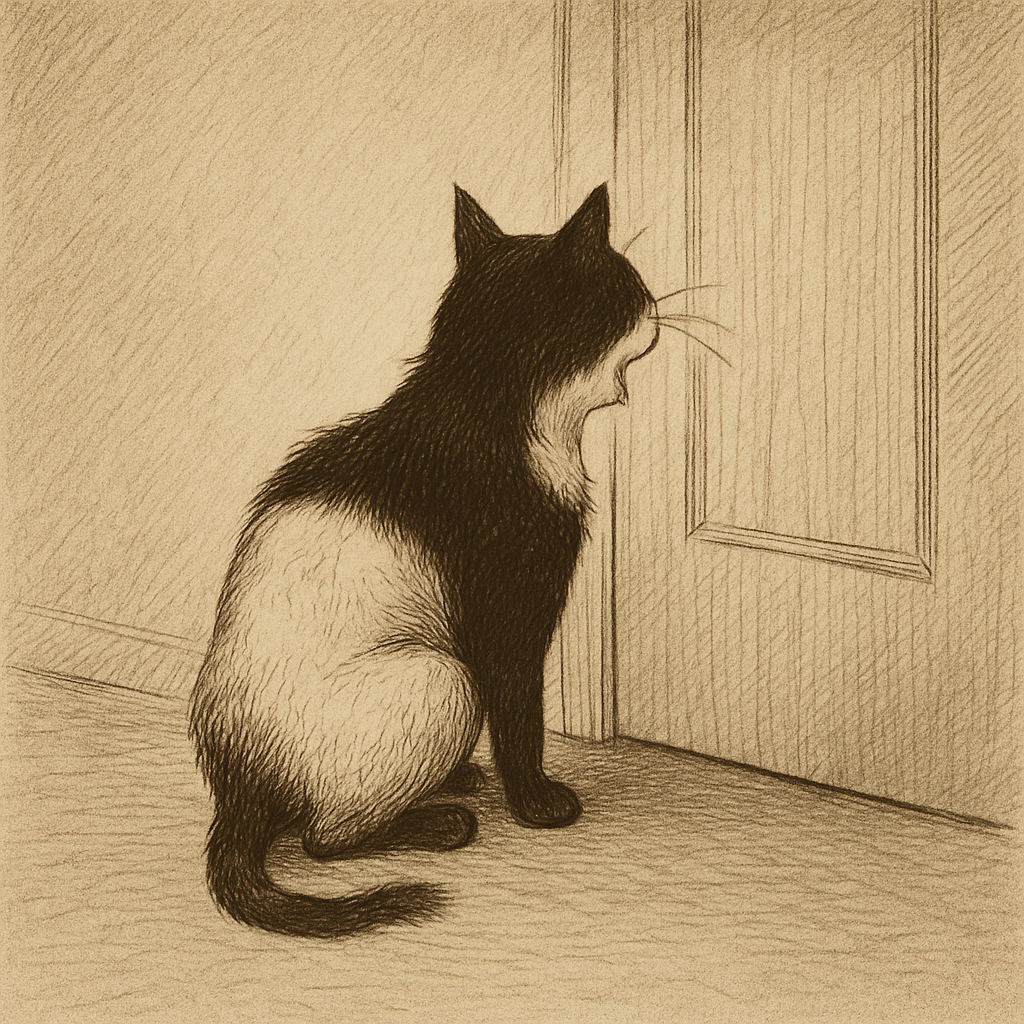 Buiten de gesloten toiletdeur miauwt de kale kat klaaglijk. De kale klaaglijk miauwende kat krabt en krioelt. Ik kijk mijn eigen kat aan. Ze kijkt me met een onbestemde blik terug aan. Dan lees ik maar wat verder. Misschien is de volgende bladzijde wel spannend.