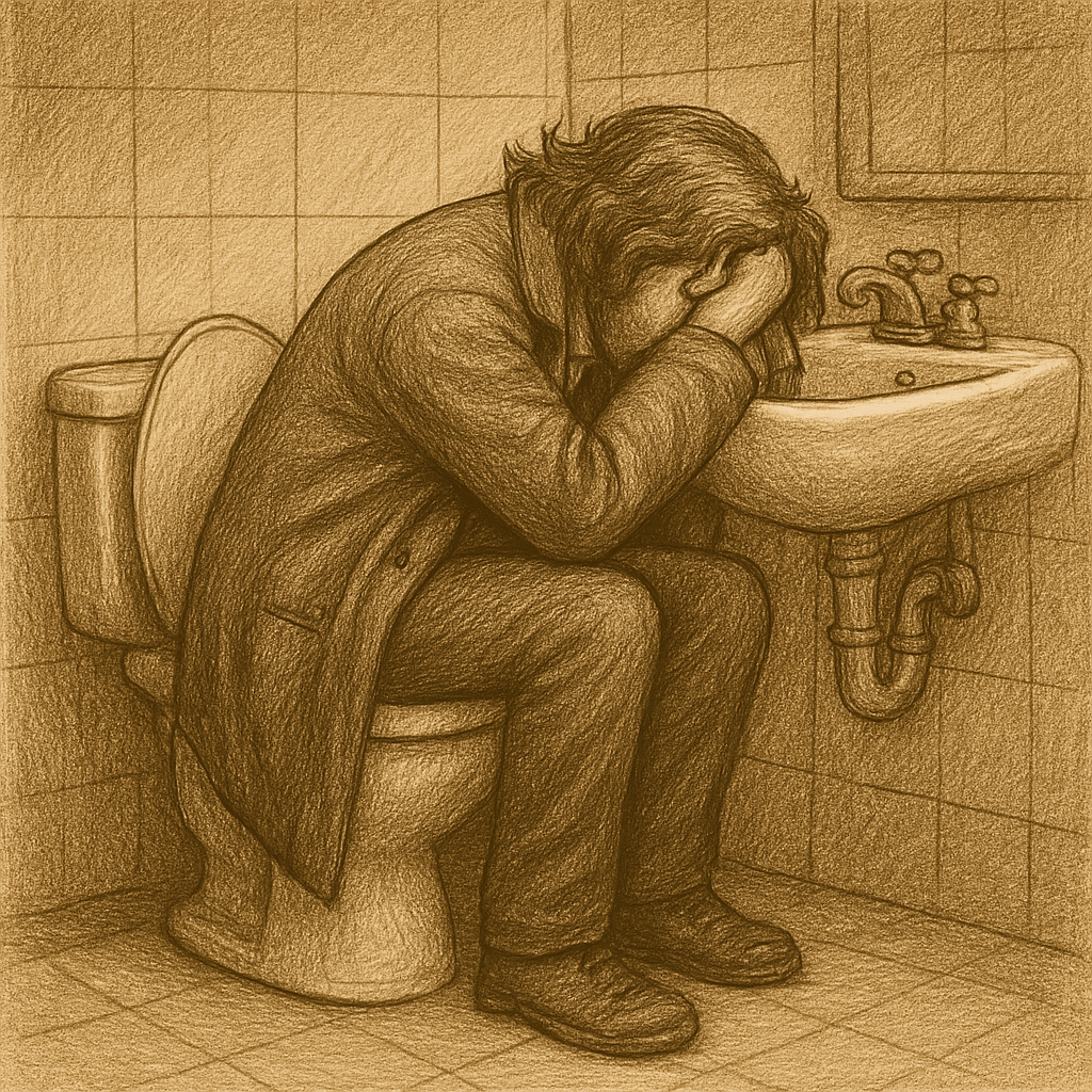 Hijgend hang ik boven de smurrie in de gootsteen, spugend en kokhalzend. Als het nou was omdat ik teveel gedronken had, dan kon ik ermee leven. Maar vandaag dronk ik enkel water en koffie. Oh hee, ik zie ook wat koffie tussen de soep. Ik roer verwonderd wat met mijn vinger in de plotskots terwijl er verse spetterpletter op het porcelein klettert. En ja hoor, natuurlijk komt er nóg een golf naar boven. Ik kledder het erbij in de gootsteen en vraag me af hoe lang nog. Dit is alvast de tweede ronde vannacht en slapen doe ik op dit moment in korte etappes van een uur, waar ik zwetend uit wakker word.
