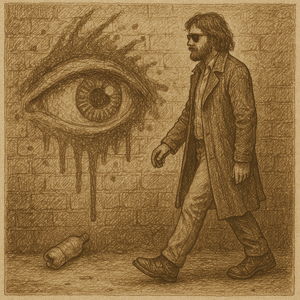 Mensen liepen massaal voorbij zonder één blik op het oog te werpen. Maar ik werd er nieuwsgierig van. Gehurkt inspecteerde ik de afbeelding grondig. Er was absoluut iets mee, maar geen idee wat. Ik hurkte andersom en volgde de zichtlijn van het getekend oog. Daar zag ik enkel een vertrapt frisdrankflesje. Even bleef ik zitten want misschien zag ik het fout, maar er was niets bijzonders. Het oog was op een kapot flesje gericht. Beteuterd stond ik op en liep door.