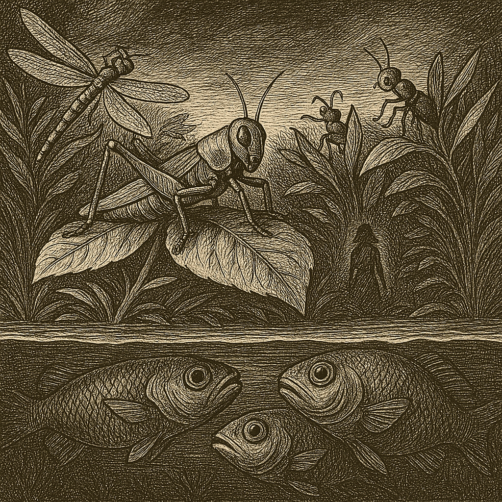 De insecten slaan ons gade. Ze waren hier al eerder. Vanonder het wateroppervlak naderen de vissen de insecten. Zij waren er nog eerder. In het Duits is een Zuchtperiode ook maar een woord voor het kweken van duiven. De man met de baard hoopt dat hij vlug weer weg mag. Hij mist zijn ruime sop. Maar het regent, dus dat is ook iets waard. En hij gaat over tot de orde van de dag.