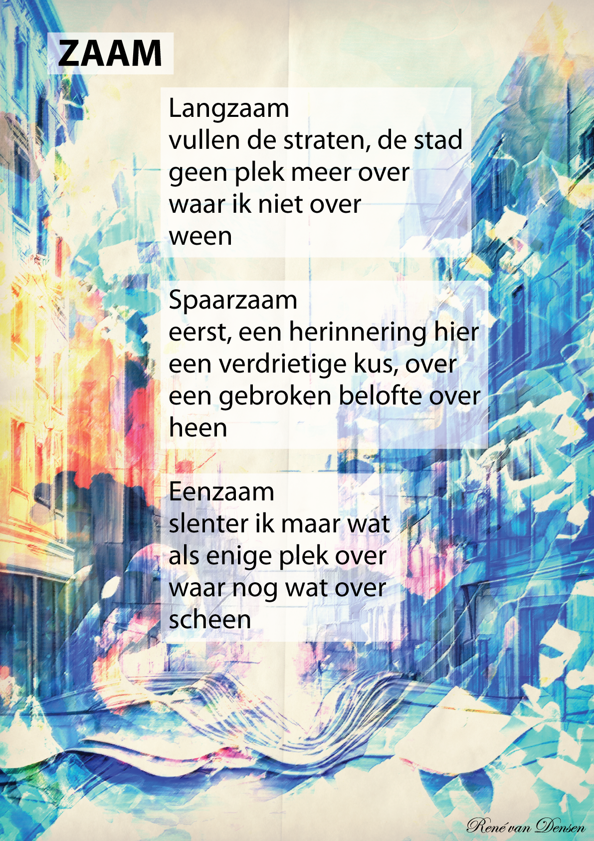De vierde dichtbundel van René van Densen verkent als thema verhuizen, transitie van één situatie naar een andere. Waarbij je altijd dingen kwijtraakt, maar er ook iets nieuws ontstaat, gesymboliseerd door kleine poëziedoosjes die je kunt uitknippen en die een nieuw gedicht vormen, maar waarbij je dan wel zes andere gedichten moet laten verdwijnen. Verdeeld in metaforische ruimtes in een nieuw huis verkent Van Densen wat je wel of niet mee moet nemen.