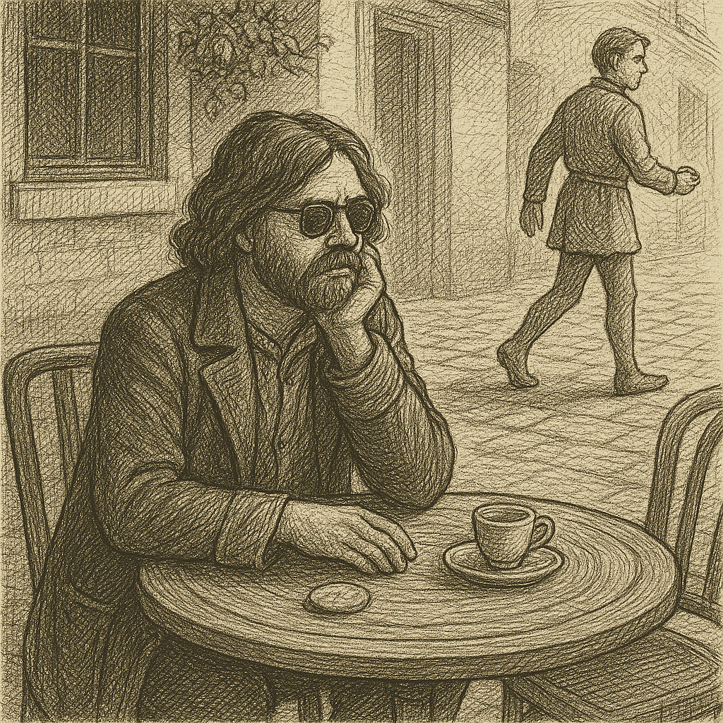 De koekjesman is een groot kind, met schuchtere, verlegen ogen. Hij zegt niks maar geeft een kleinekindjesglimlach terwijl hij op ons terras afschuifelt. Als hij een mooie jonge vrouw ziet, geeft hij haar met een bescheiden knikje een in zilverpapier gewikkelde kauwgom uit zijn pakje. De bardame krijgt sowieso een kauwgom. Los van dat ze jong en beeldschoon is, en een van de redenen dat ik hier zelf graag kom, heeft ze koekjes. Gewoon, speculoos in plastic van bij de koffie. De koekjesman krijgt plastic voor zilver en schuifelt tevreden weg. Of hij het koekje later elders opeet, of dat ook weer aan iemand gaat geven, weten we niet.