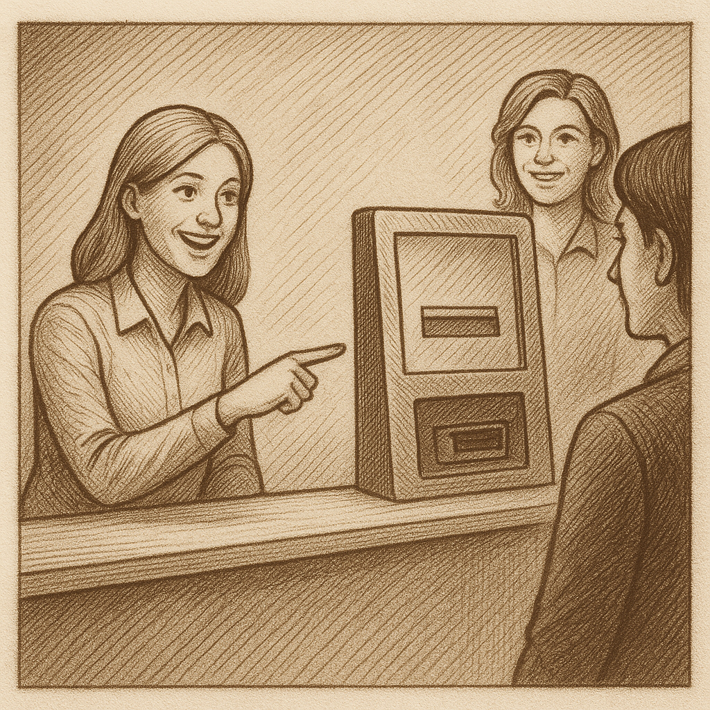 Eens ik bij het scherm sta, staat er een vrouw naast om te wijzen op de sluif waar ik mijn identiteitskaart in moet steken. Er staat identiteitskaart bij aangegeven en op het scherm zelf staat dat woord ook, met een grote pijl. Ik zie mijn adres en telefoonnummer gigantisch groot op het scherm en dat ik nu een afspraak heb. Er is een enorme knop in beeld met bevestigen. De mevrouw zegt dat ik op bevestigen moet klikken en mijn pas moet terugnemen. Ik druk op de knop en het scherm zegt dat ik mijn pas moet terugnemen en naar wachtzaal 1 moet gaan. De vrouw neemt mijn arm en wijst me waar wachtzaal 1 is. Er is maar één wachtzaal.