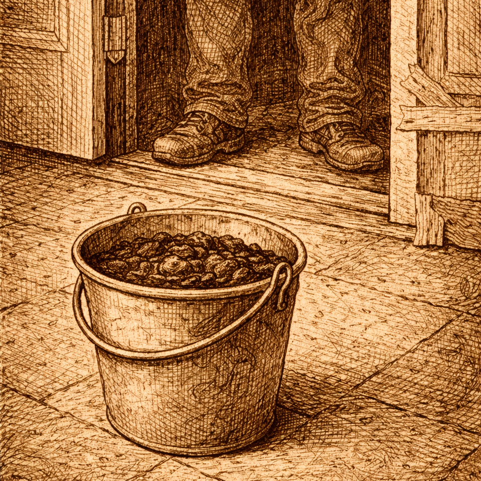Ik zet binnen de emmer oei bij de andere emmers oei. Ze stapelen zich op, maar ik weet niet hoe ik van oei af moet komen. Ik had wat gezocht op internet, maar er waren verrassend veel porno-resultaten. Weinig instructievideo’s. Ik vond er één: een man die toonde hoe je oei in een emmer giet, zelf bleef hij buiten beeld, ik herkende de stem niet. Dan loopt hij met de emmer de straat op en enkele blokken om – hij heeft de wandeling geëdit en alle straatstenen lijken op elkaar. Dan zet hij de emmer oei voor een deur neer en zegt “voilà.” Hij zoomt uit en ja hoor. Het is mijn deur. Ik staar even naar de emmer en vermoed dat die oplossing voor mij niet gaat werken.