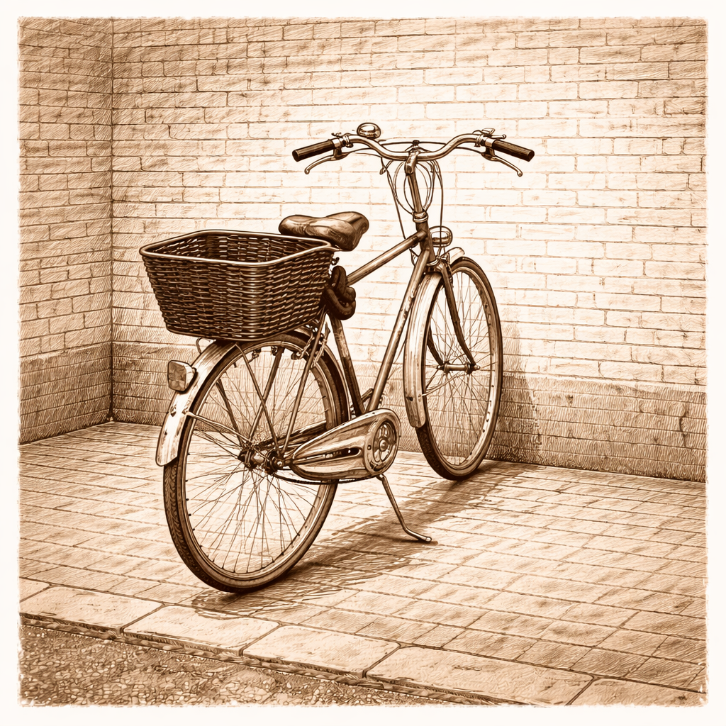 Het zou allemaal kunnen, mijn fiets is oud. Ik zie hem er wel voor aan, ondanks zijn knalrode lak en chromen vleugeltjes boven de ketting, dat hij eigenlijk een saaie ouwe zak is. Knap in zijn dagen geweest, maar nu interesseert het de dames niet meer. Ze zijn allang naar de volgende shopping experience gevlucht. Staat hij daar, een beetje in zijn eentje in de zonneschijn. Het heeft wat tragisch.
